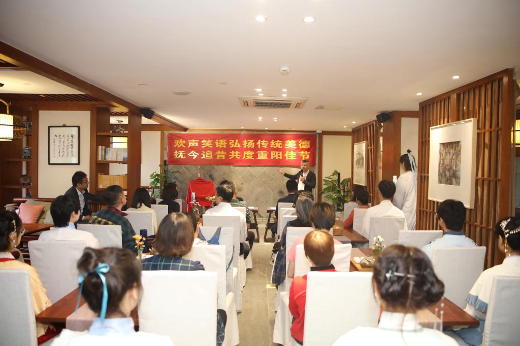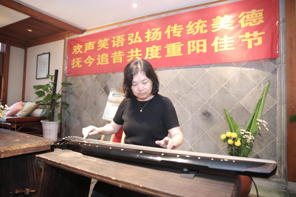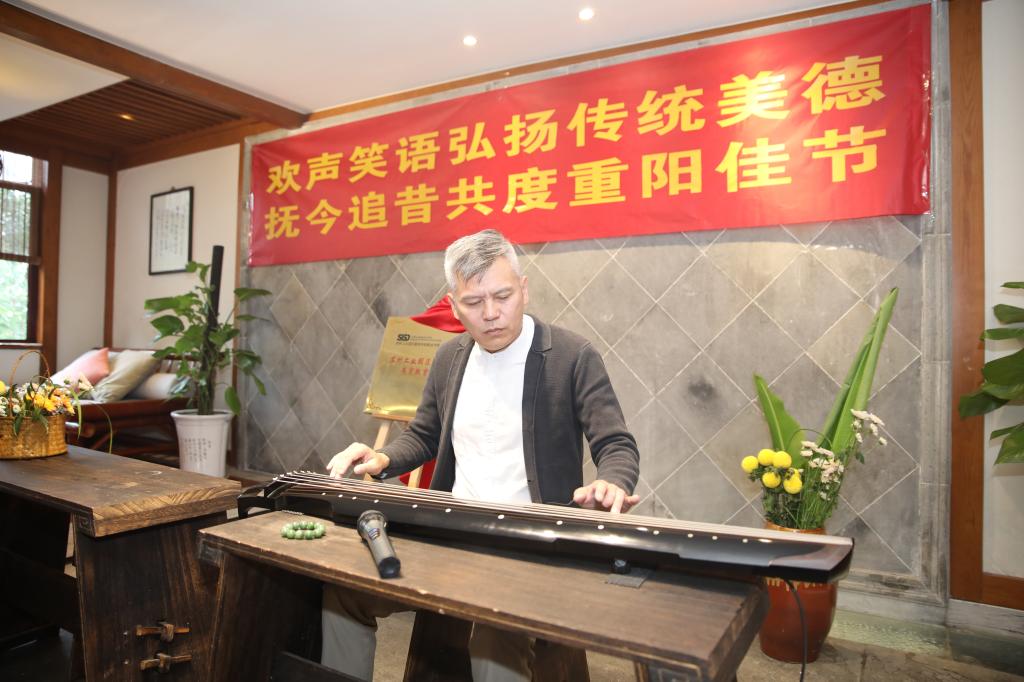 随后,朱正明抚琴表演,学校多名荣休教师也纷纷展示了古琴、京剧等才艺。金融科技学院学生们现场还进行了书法和水粉画创作。学生代表为荣休教师佩戴上了装有茱萸的佩囊,表达对他们的敬意,传统的“茱萸囊”带来了满满的重阳节仪式感。师生们欢聚一堂,在“雅集”中感受传统文化的魅力,并共同品尝重阳糕,同庆九九重阳。