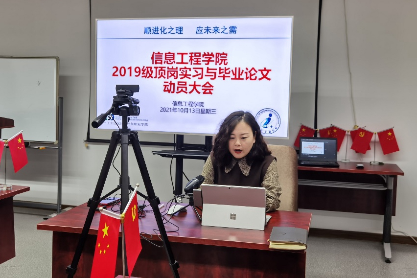 为全力保障学生校外顶岗实习教学顺利进行,全心服务学生的毕业就业工作,信息工程学院于10月13日召开了2019级顶岗实习与毕业论文动员大会,并邀请了7家重点合作企业做了宣讲。大会采用线上直播形式,组织学生以班级为单位在教室集中观看。