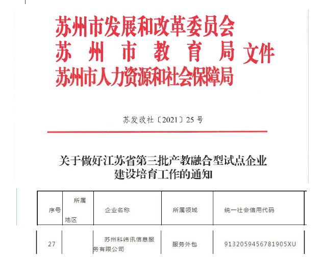 10月25日,江苏省发改委、江苏省教育厅、江苏省人力资源社会保障厅联合发文,公布了江苏省第三批产教融合型试点企业名单,我校紧密合作企业——苏州科纬讯信息服务有限公司入选试点企业名单。全省共51家企业入选,苏州市17家企业荣膺其列。