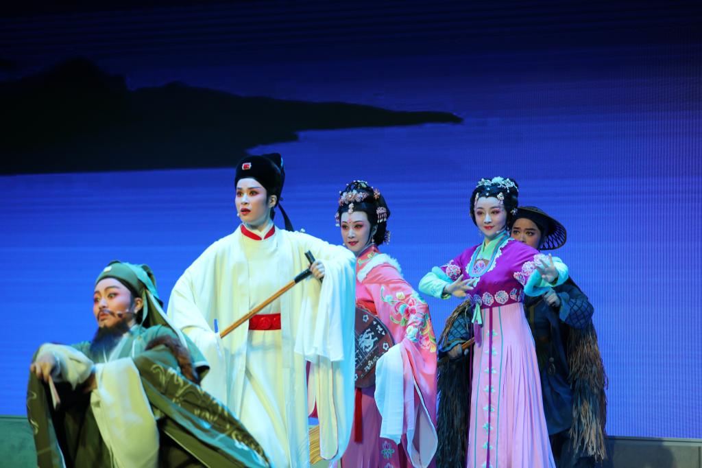 随后,演员们用空灵、唯美、典雅、大气的演绎,带领全场师生走进了“诗仙”李白浪漫的精神世界,通过李白和玉真凤凰台上“三登”“三别”,以及“追舟”“弃座”“抽刀断水”等情节,将耳熟能详的经典与优扬婉转的唱腔、青春靓丽的舞台形象有机融合,对诗与爱、浪漫与潇洒、自由与永恒等主题进行了诗意呈现。师生们纷纷表示,剧中高远的人生境界和审美意象引人入胜,让人充分感受到越剧的无限艺术魅力。