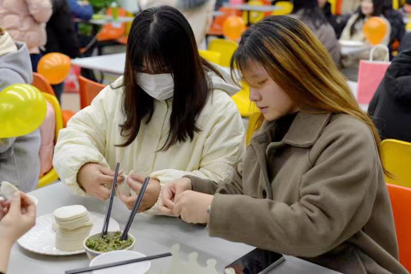 活动中,师生一同为13名学生庆祝生日。老师们为他们切分蛋糕并赠送生日小礼品,同学们也纷纷向他们送上生日祝福。在包饺子活动中,学生们各显神通,设计出各式各样的饺子。在老师和同学的评选下,一些饺子“脱颖而出”,被评为“最标志的饺子”和“最调皮的饺子”。饭桌上,师生们讨论着各自家乡冬至的习俗,透露着对中国传统文化的满满热爱。