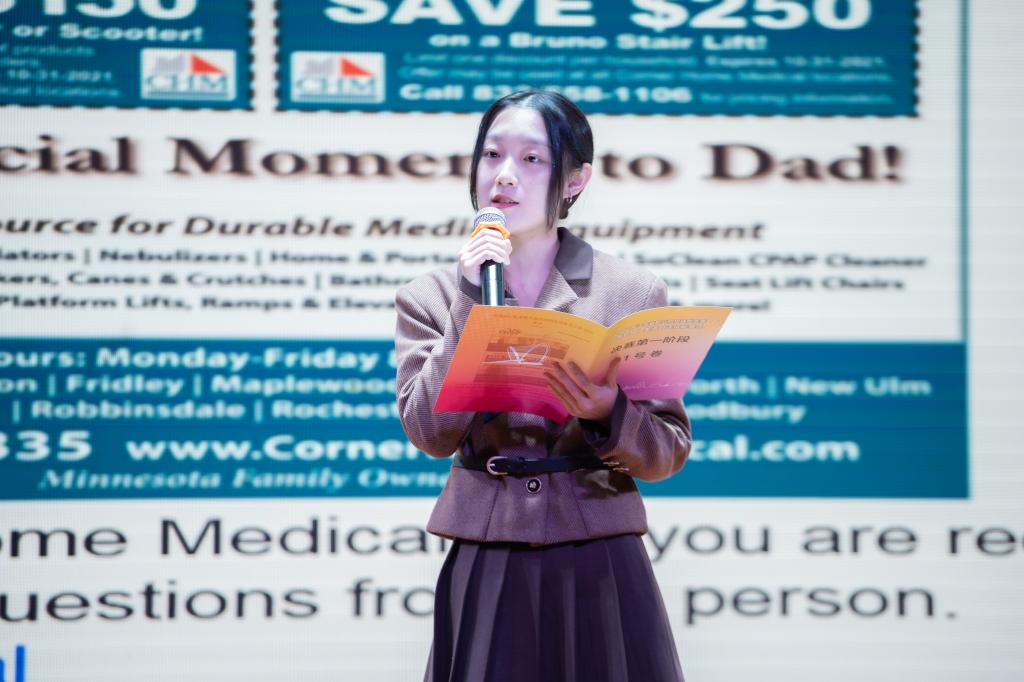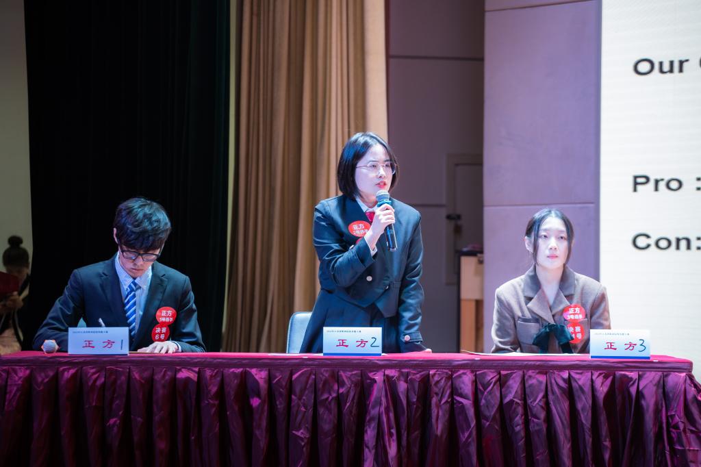 即席辩论环节,由非英语专业组取得前四名的选手和英语专业组取得前两名的选手参加,大家组成正反两方,围绕“实体书店会不会消亡”的话题展开了唇枪舌战的辩论。在正方观点陈述、反方观点陈述、自由辩论等环节中,选手们凭借娴熟的英语表达能力,展示出了最佳的状态,观点鲜明、思路清晰,有较强的说服力;旁征博引,妙语连珠,有强烈的感染力;充分展现了鲜明的个性、十足的自信和飞扬的风采。