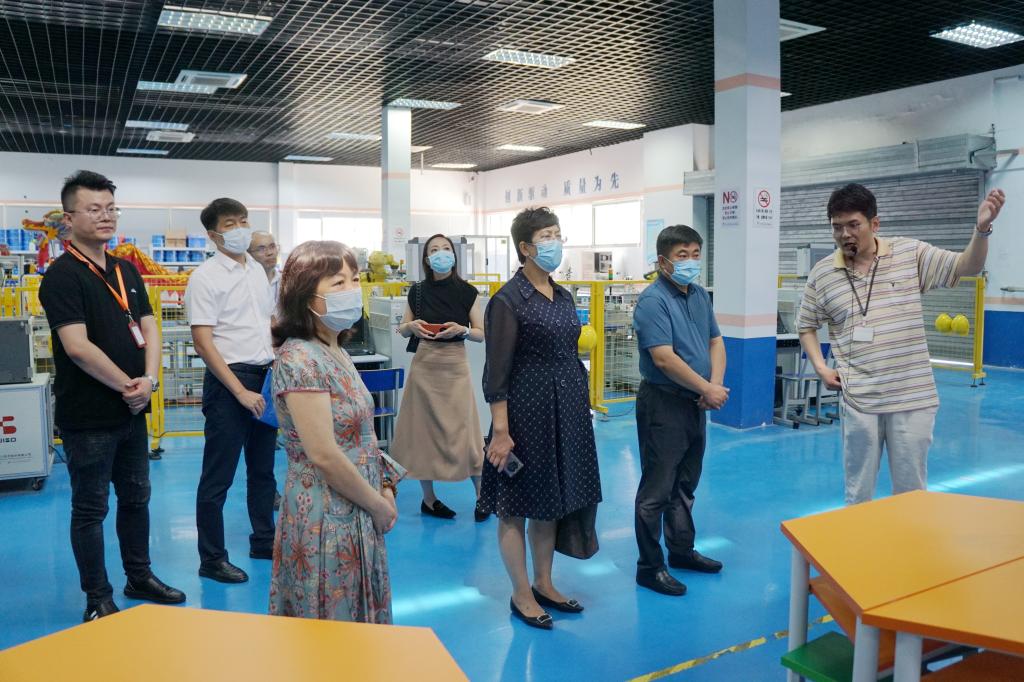 会前,简小东一行在强晏红的带领下参观了工业技术学校校区智能制造产学研基地,了解了智能制造装备、智能机器人、智能飞行器等实训中心建设,并对我校为政府主导的战略性新兴产业培养人才所取得的成果表示赞赏。