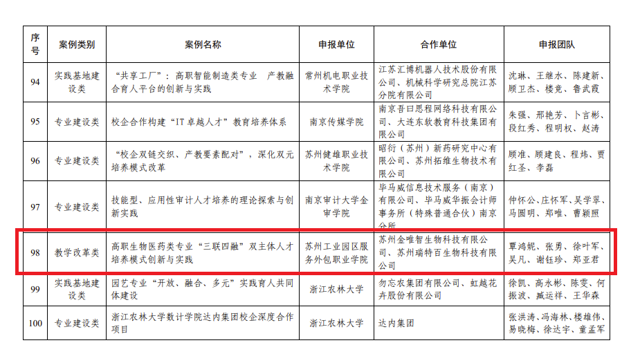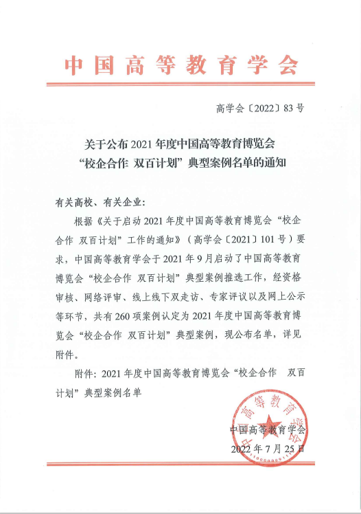 中国高等教育学会于2021年9月启动本轮“校企合作 双百计划”典型案例推选工作,经资格审核、网络评审、线上线下双走访、专家评议以及网上公示等环节,共有260项案例认定为2021年度中国高等教育博览会“校企合作 双百计划”典型案例,我校“高职生物医药类专业‘三联四融’双主体人才培养模式创新与实践”案例名列前茅。
