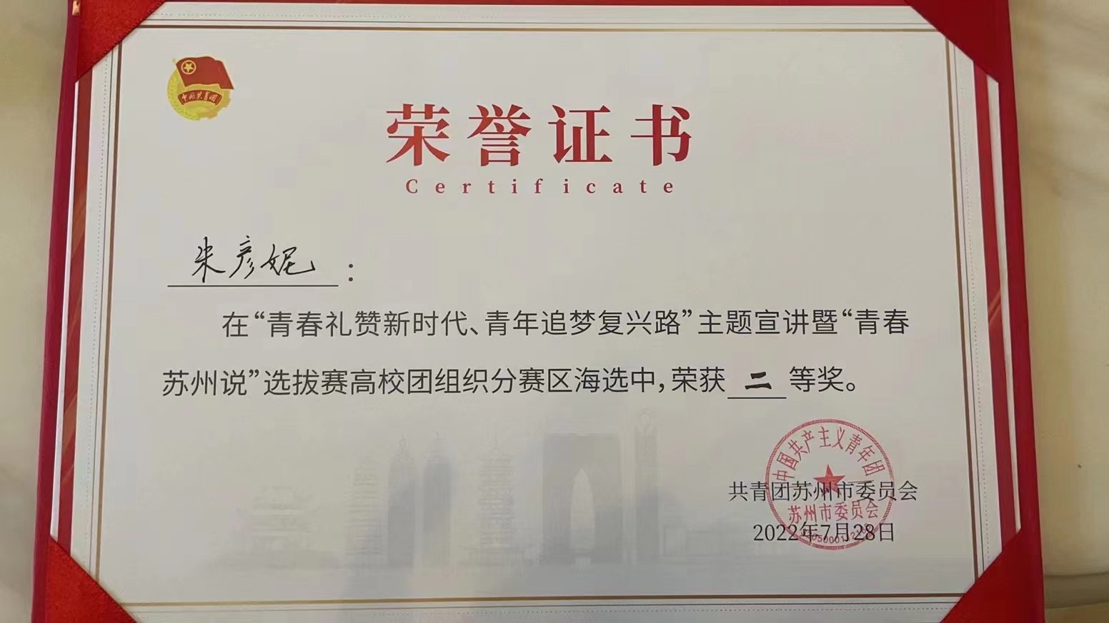 7月28日,由苏州市委宣传部、市委教育工委、团市委、苏州广电联合举办的“青春礼赞新时代、青年追梦复兴路”主题宣讲暨“青春苏州说”选拔赛落下帷幕,我校马克思主义学院教师朱彦妮荣获二等奖,入围复赛。