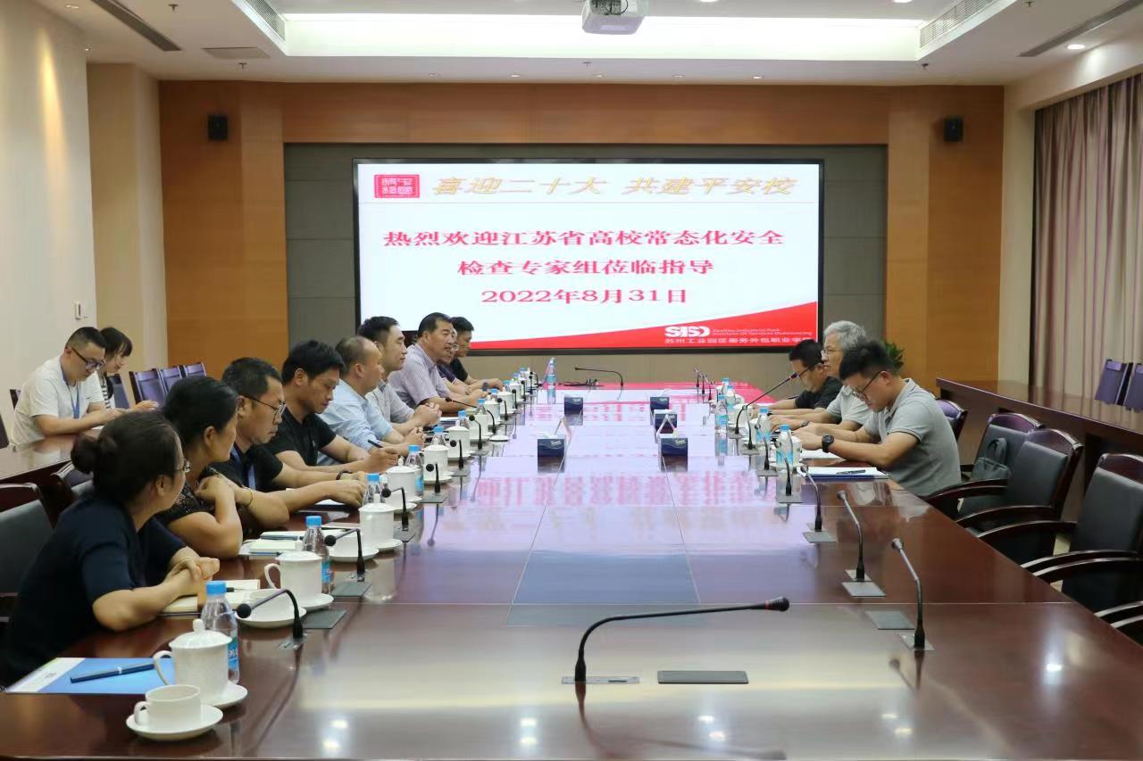 朱永涛代表检查组首先强调了喜迎二十大之际,省教育厅组织全省校园安全常态化大检查的意义。陆海宾介绍了我校当前安全方面的实际情况以及我校先后荣获江苏省平安校园、江苏省平安校园建设示范高校、苏州市单位治安保卫工作集体嘉奖、苏州工业园区平安园区建设先进单位等荣誉。