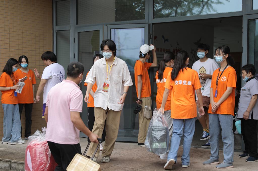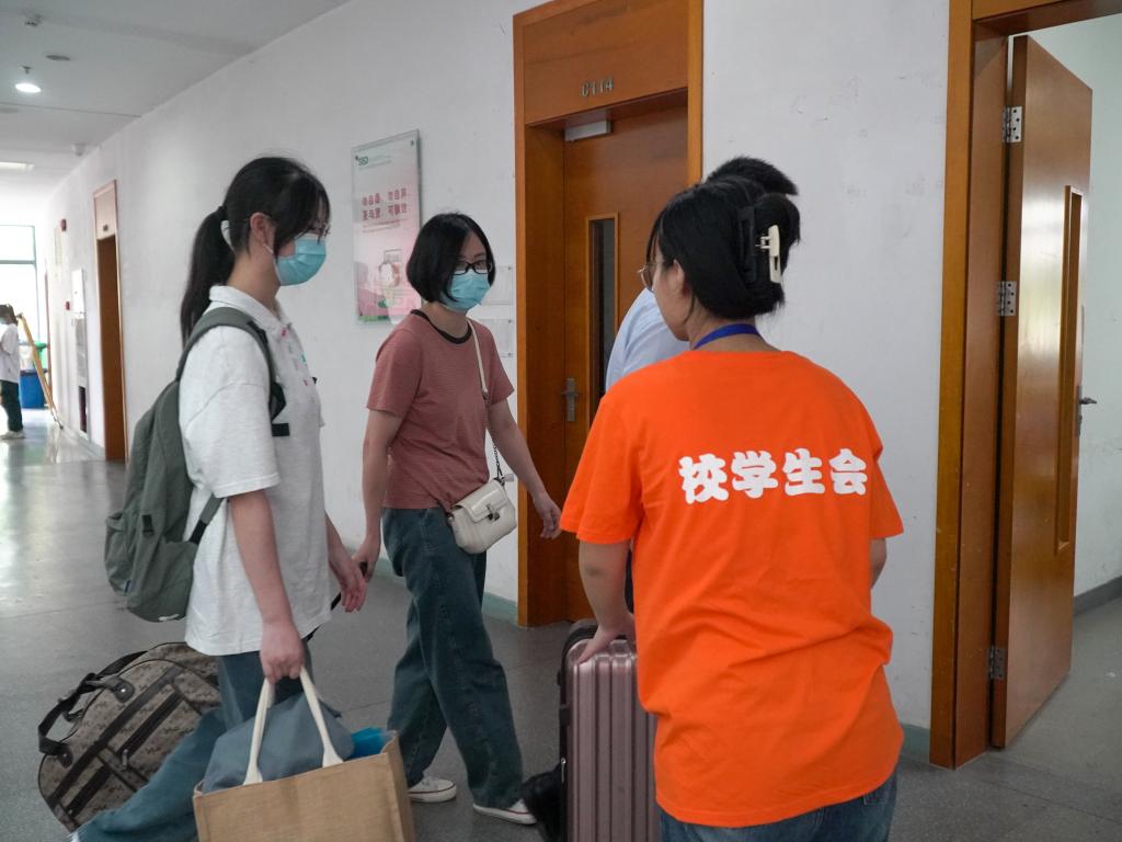 在新生宿舍7号楼、8号楼大厅内,各系教师、志愿者和宿管老师们分工明确、秩序井然,配合有序地为2022级新生办理入住手续。各个点位的志愿者们,为前来报到的住宿生提供路线指引和行李运送服务。学生们热情贴心的服务,赢得了新生们的一致称赞,也令家长们竖起了认可的大拇指。