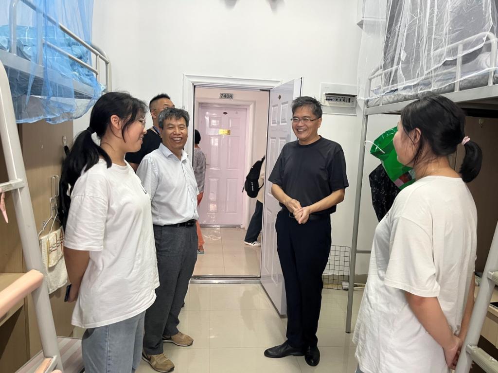 随后,严世清一行分别走访调研了5号、6号和7号宿舍楼。他强调了在大学中学会集体生活的重要性,并希望学生们要形成相互关心的良好氛围;他还特别鼓励学生们多从宿舍里走出去,要加强体育锻炼。