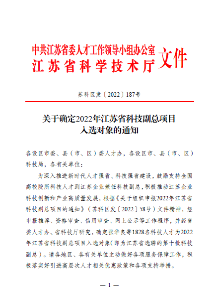 今年8月,江苏省委人才办、江苏省科技厅印发了《关于确定2022年江苏省科技副总项目入选对象的通知》,我校金融科技学院书记、院长宋翠玲博士成为我校第6位入选该项目的教师。