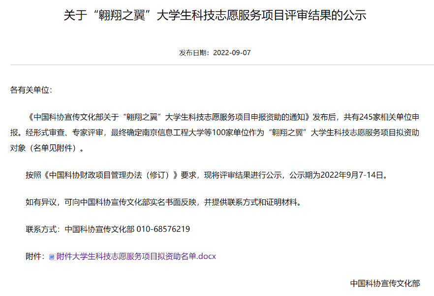 9月15日,由中国科协宣传文化部主办的“翱翔之翼”大学生科技志愿服务项目评审结果公示结束,我校科协申报的《“让创新动能更澎湃”科普教育行动》获批立项。此次中国科协宣传文化部拟资助100家单位,江苏省共获批11项,我校是江苏省唯一获批立项的高职院校。