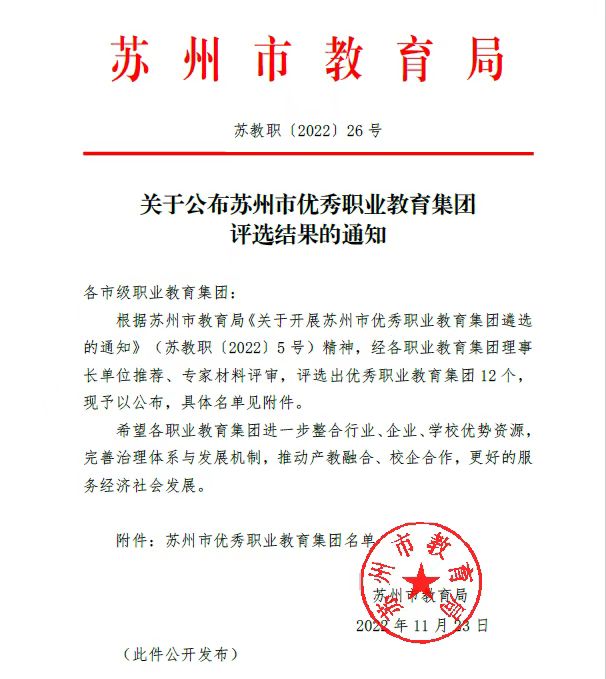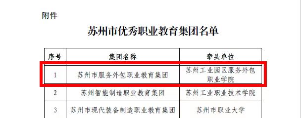 11月23日,苏州市教育局公布了2022年苏州市优秀职业教育集团评选结果,我校牵头建设的苏州市服务外包职教集团各项发展指标优异,位列考核榜首。
