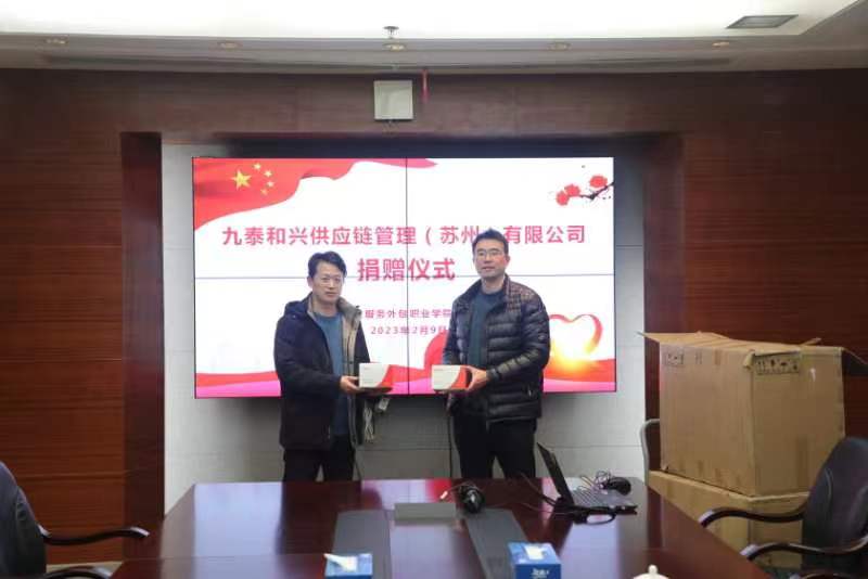 2月9日下午,我校深度合作企业九泰和兴供应链管理(苏州)有限公司向我校捐赠3000份新冠抗原检测试剂。九泰和兴供应链管理(苏州)有限公司董事长龚伟东,智能管理学院党总支书记、院长杜梓平及相关负责人参加了捐赠仪式。