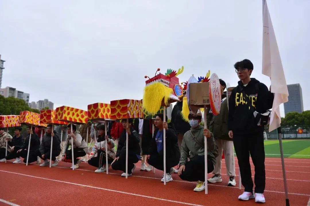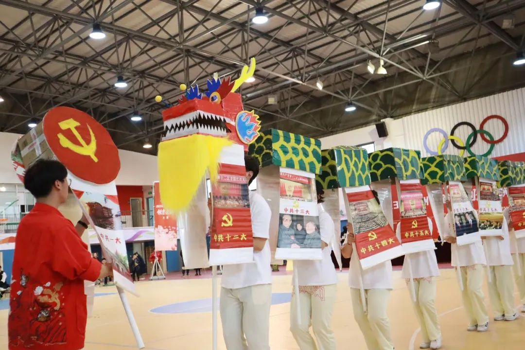 在“风华正茂”创意龙表演中,藏于龙身中的画轴为“党的一大”到“党的二十大”的图片,展示了是中国共产党的百年风华。在“功勋卓著”创意龙表演中,学生们将藏于龙身中的画轴揭开,无数英雄先辈的面庞出现在观众的视野中,展示了师生们对时代英雄的景仰和赞美。龙狮队表演在音乐的烘托下,珠行龙走、龙跟珠行,快速有序,动作步伐一致,完成翻、滚、腾、跳、穿等动作。龙形变幻,惟妙惟肖,极具观赏性,同时展示内容又紧扣课程思政,将创意思政与传统民俗、竞技体育相融合。
