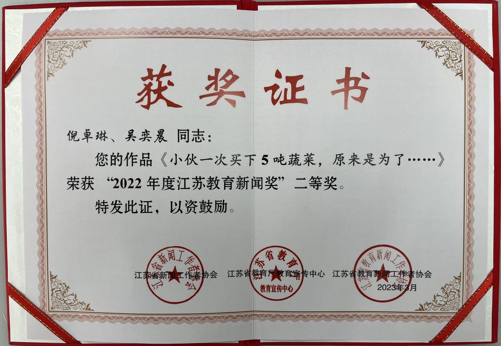 今年3月,由江苏省新闻工作者协会和江苏省教育厅教育宣传中心(江苏教育报刊总社)联合主办、江苏省教育新闻工作者协会承办的“2022年度江苏教育新闻奖”的评选活动公布评选结果,我校报送的新媒体新闻专题作品《小伙一次买下5吨蔬菜,原来是为了……》获得二等奖。