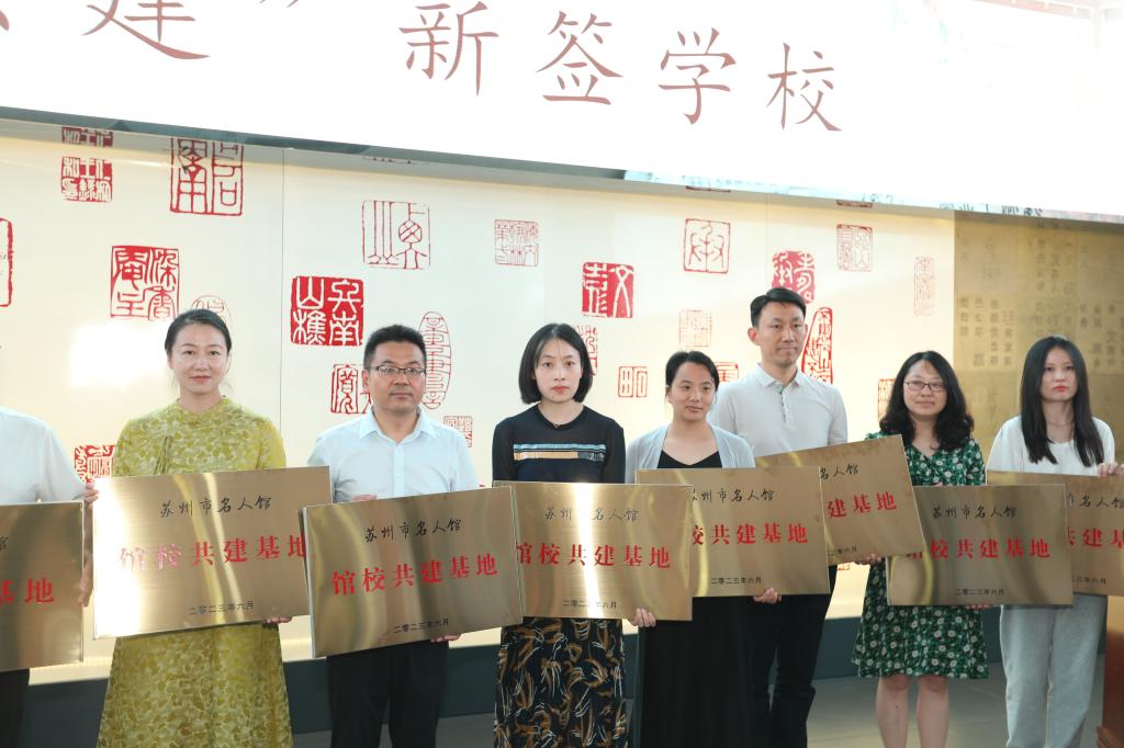 签约仪式上,我校党委办公室主任冯恒莉与苏州市公共文化中心名人馆管理部部长王晨共同签订了此次“馆校共建”合作协议书。苏州市姑苏区委宣传部副部长、文明办主任周娴与苏州市公共文化中心副主任杨文涛为我校授牌苏州市名人馆“馆校共建基地”。