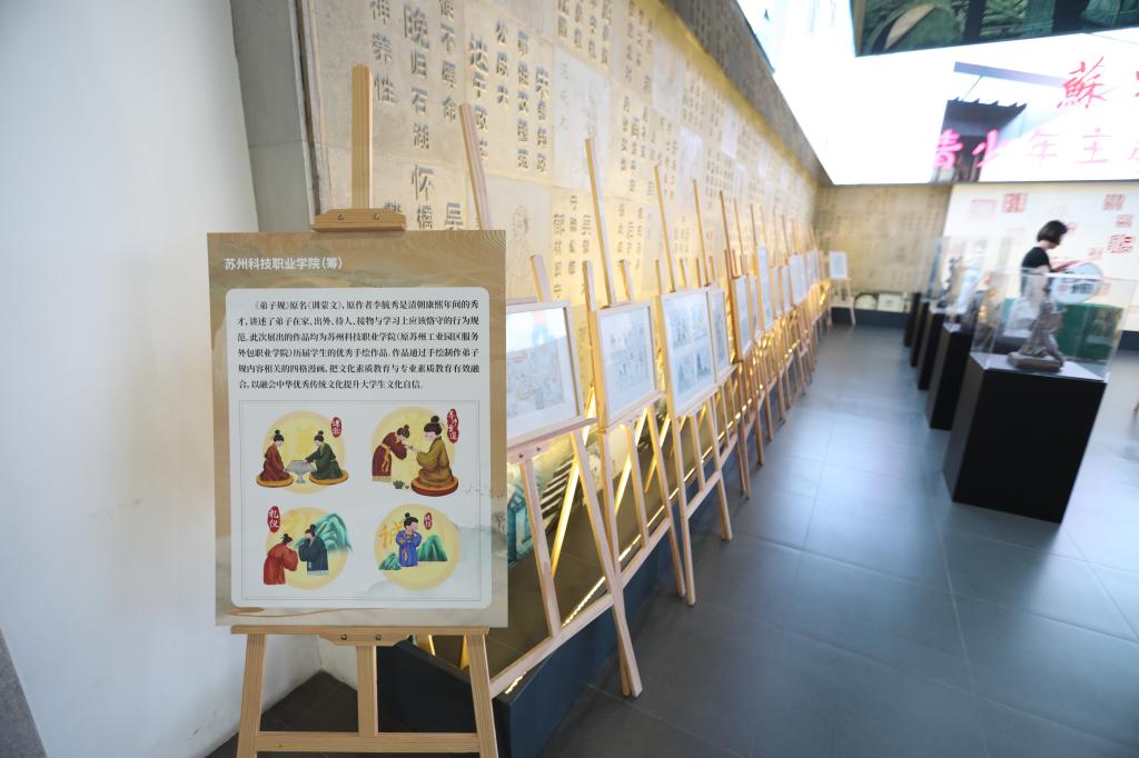 作品展中,《弟子规》四宫格漫画是我校学生在学完弟子规课程后,通过手绘创作的弟子规内容的四格漫画。作为传统文化教育特色之一,我校将传统《弟子规》内容进行现代性转化后,将国学内容引入现代服务业职业素养,面向全校学生开设了《弟子规与职业素养》课程。我校教师张建亮编著的教材《弟子规与职业素养》曾获江苏省2018年“十三五”重点规划教材。在线开放课程《弟子规与职业素养》曾获2018年、2022年国家职业教育精品在线开放课程、江苏省职业教育首批精品在线开放课程等荣誉。学校每年举办一届弟子规漫画节,把文化素质教育与专业素质教育有效融合,以融会中华优秀传统文化提升大学生文化自信。此次展出的20余幅作品均为我校历届学生的优秀手绘作品。