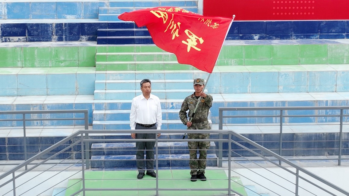 吕中起向2023级军训团授团旗,各连队教官入列。
