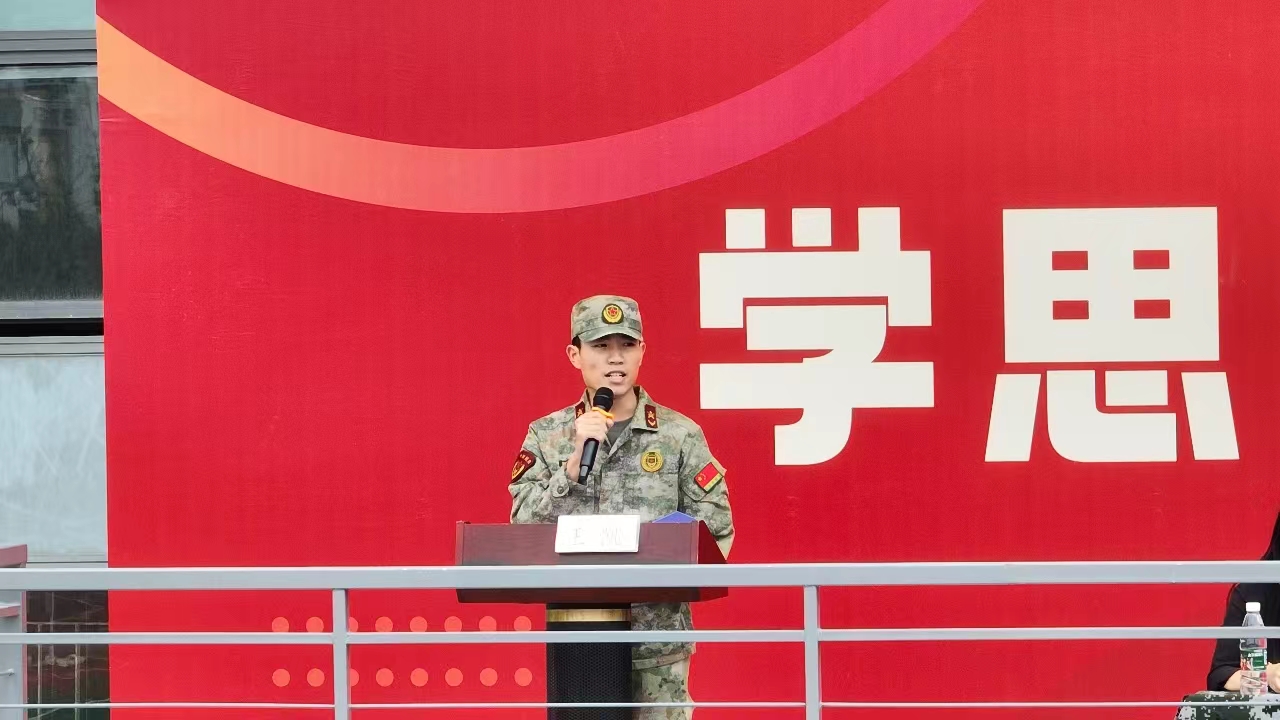 我校大学生退伍军人、商务管理学院商务212班邱郅文代表全体军训教官团成员表态发言,他表示将认真做好军事训练工作,严格要求,按纲施训,以良好的精神风貌、扎实的军事素养,确保各项军训工作安全、顺利、圆满完成。