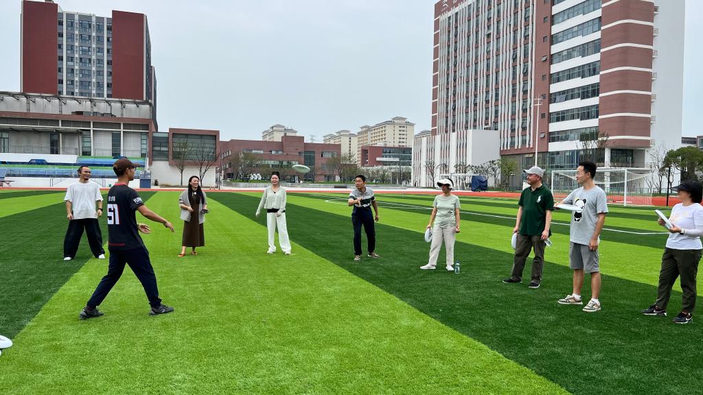 随后,大家在操场上进行双人对抗练习、飞盘接力、飞盘高尔夫、飞盘比赛等项目。从“奔跑起跳、对接、冲刺、欢笑”,每一次飞盘传接互动,都传达出团结友爱、互帮互助的品格和热爱运动、追求良好身体素质的体育精神。飞盘友谊赛中,进攻方队员的默契接盘,防守方队员的奋力抢断,都构成了操场上最美丽的风景。