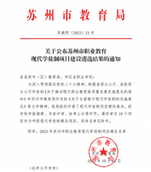 10月18日,从苏州市教育局官网获悉,我校电气自动化技术专业“儒拉玛特电气工匠现代学徒制”项目顺利通过市级评审,被认定为2023年苏州市职业教育现代学徒制建设项目。