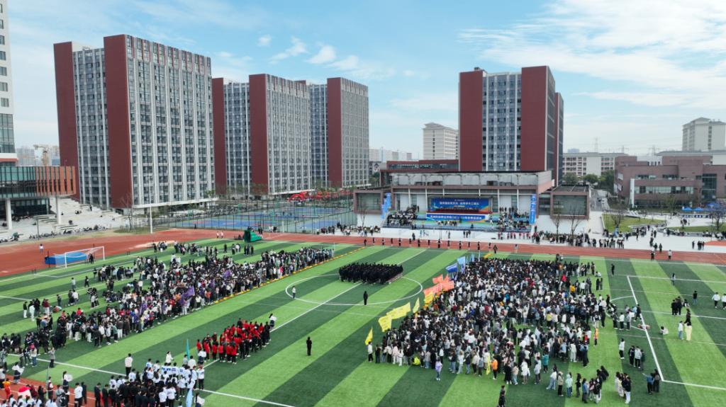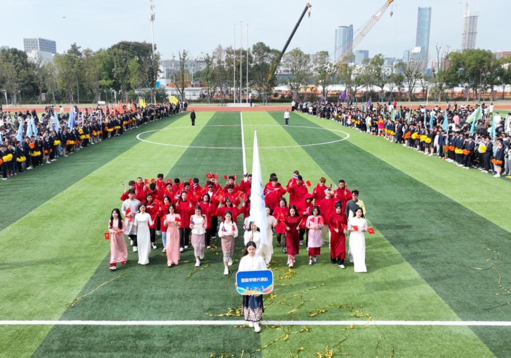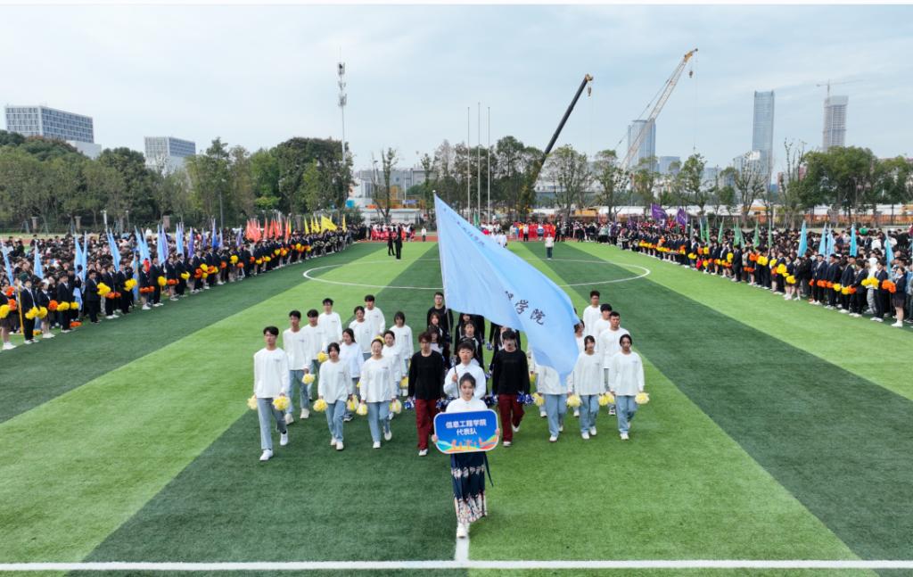 入场式在活力四射的百人团体操表演《超燃少年》中拉开帷幕。激昂青春的旋律、整齐划一的队列、矫健有力的身姿,不时赢得全场阵阵掌声。接着,教工代表队、八大学院及国际学院代表方阵分别用各具特色的形式步入场地,将现场氛围推向了高潮。从传统的舞龙表演、炫酷的航模展示、铿锵有力的扇舞到创意满满、承载着美好憧憬的学院吉祥物精彩亮相……师生们用精彩纷呈的舞步、歌声和口号展现了昂扬向上、追求卓越、朝气蓬勃的精神面貌。