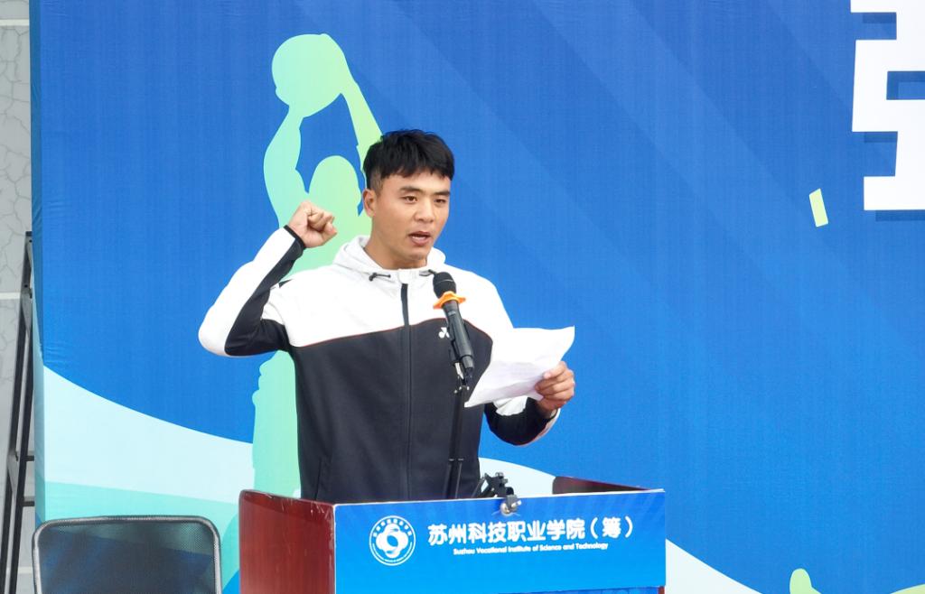 体育艺术部教师王健鑫、智能制造学院19机电1班学生姚家辉分别代表裁判员和运动员进行了宣誓,表示将在接下来的比赛中,传承和发扬中华体育精神,追求卓越、奋勇争先,展示我校师生的文明风采和优秀品质。