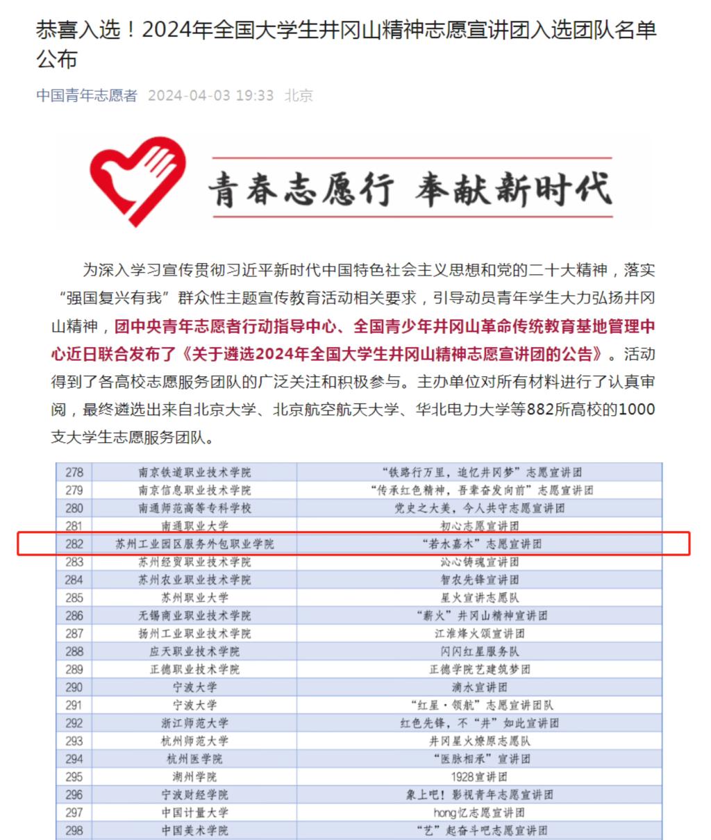 为深入学习宣传贯彻习近平新时代中国特色社会主义思想和党的二十大精神,落实“强国复兴有我”群众性主题宣传教育活动相关要求,团中央青年志愿者行动指导中心、全国青少年井冈山革命传统教育基地管理中心联合发布了《关于遴选2024年全国大学生井冈山精神志愿宣讲团的公告》。我校团委积极响应团中央号召,广泛发动申报,4月3日,由我校党校青年学员和学生骨干组成的“若水嘉木”志愿宣讲团成功入选2024年全国大学生井冈山精神志愿宣讲团。