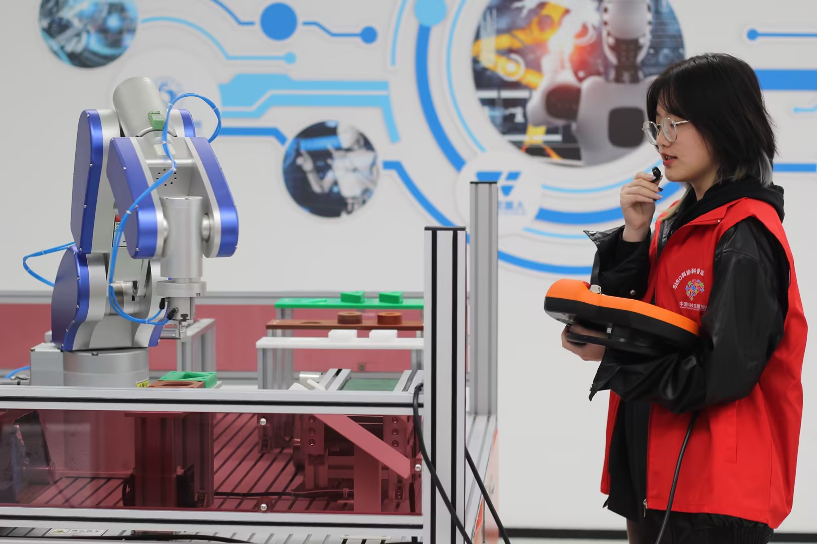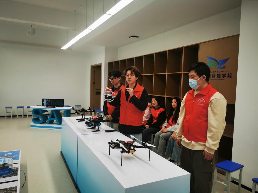 智能管理学院的大学生科协志愿者们分为不同小组展示了人工智能在不同领域的应用。陈新禹同学展示了智能制造机器人模拟物料搬运的过程。刘莘宇杰等同学演示了无人机如何跟随小车,介绍了该技术的基本原理及在不同领域的应用前景。唐立志等同学则介绍了智能小车在智慧交通沙盘中的通行,向孩子们展示了智能小车如何精确识别红绿灯、行人,准确判断路况。徐樊同学通过中医智能舌诊仪向孩子们展示了人工智能如何与传统中医结合,将舌诊过程数字化、客观化、智能化。