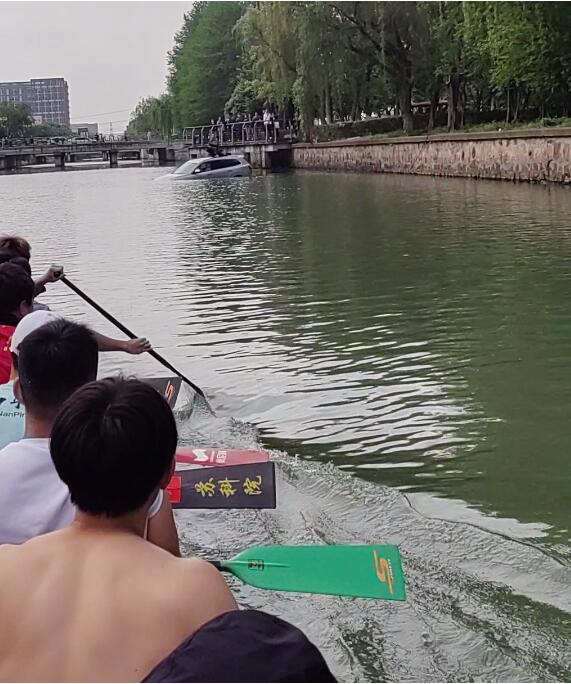 4月21日上午,在苏州工业园区独墅湖医院附近,一辆汽车掉进了河里,车主爬上车顶求救,危急时刻,正在河道里进行周末日常训练的我校龙舟队冲过来成功救起被困车主。