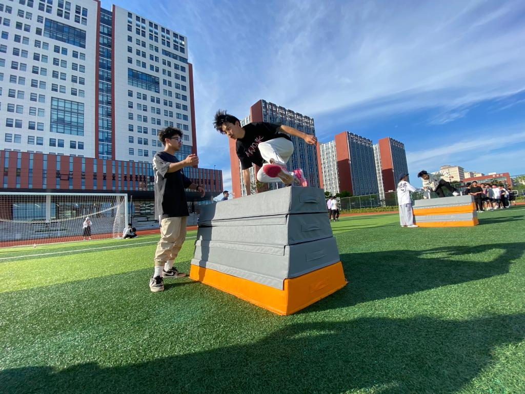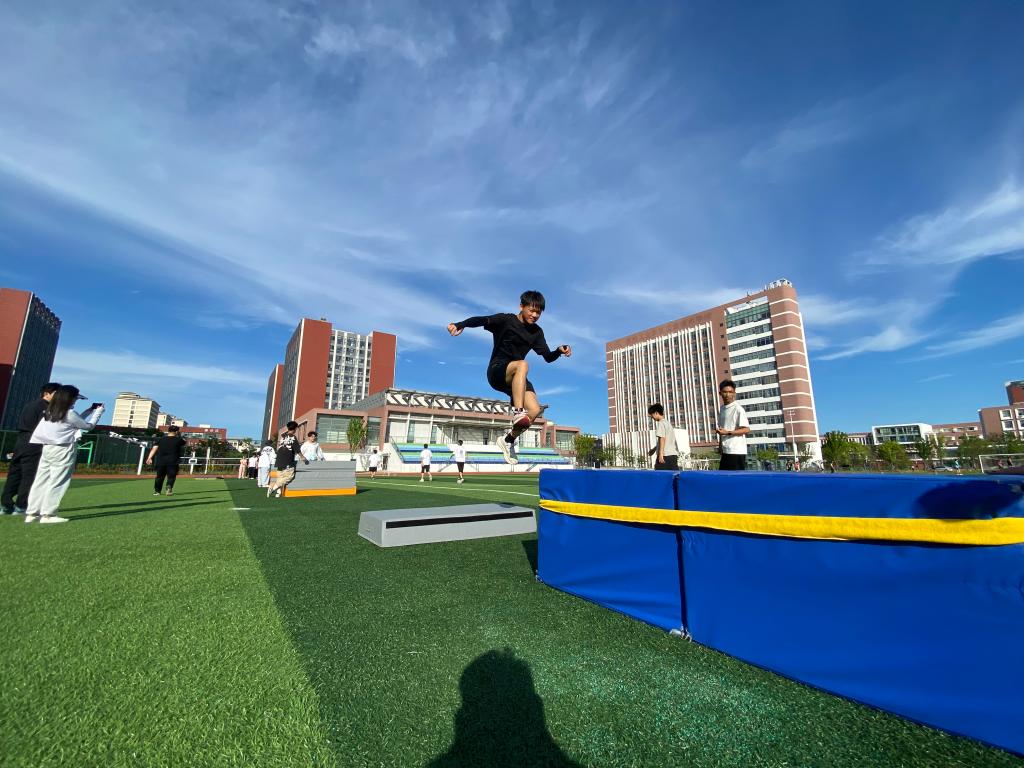 活动伊始,心理老师带领大家通过“大风吹”活动,活跃气氛,打破僵局,加速成员之间的了解。跑酷教练向大家展示了跑酷运动。随后,学生们在教练的指导下,学习翻越障碍、穿腿过、侧跨、猴跳上台等动作。他们在障碍物间跑跳穿行、翻滚攀爬、空翻腾跃。学生们纷纷表示此次活动不仅可以强身健体,有效提升了自己的应急反应速度,而且在不断突破障碍与困难的过程中,激发了自己的潜力。