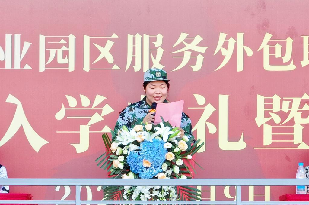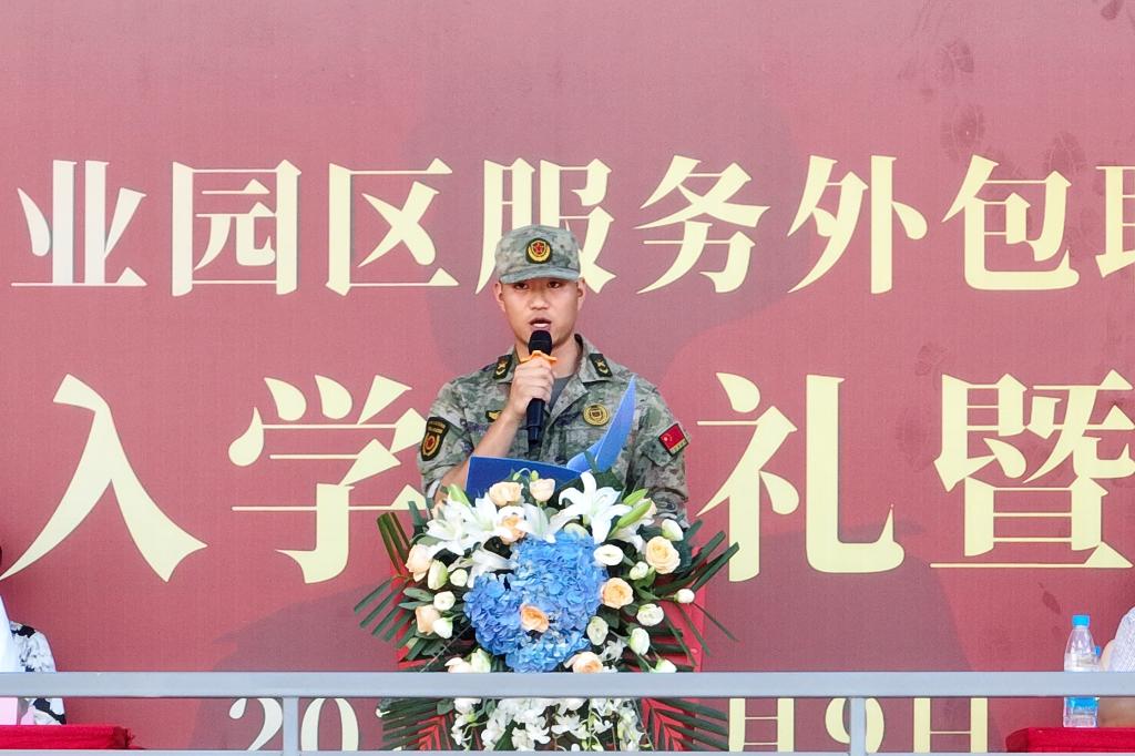 园区人武部韩俊超队长代表全体军训教官团成员作表态发言,他表示将认真做好军事训练工作,严格要求,按纲施训,以良好的精神风貌、扎实的军事素养,确保军训工作安全、顺利、圆满完成。