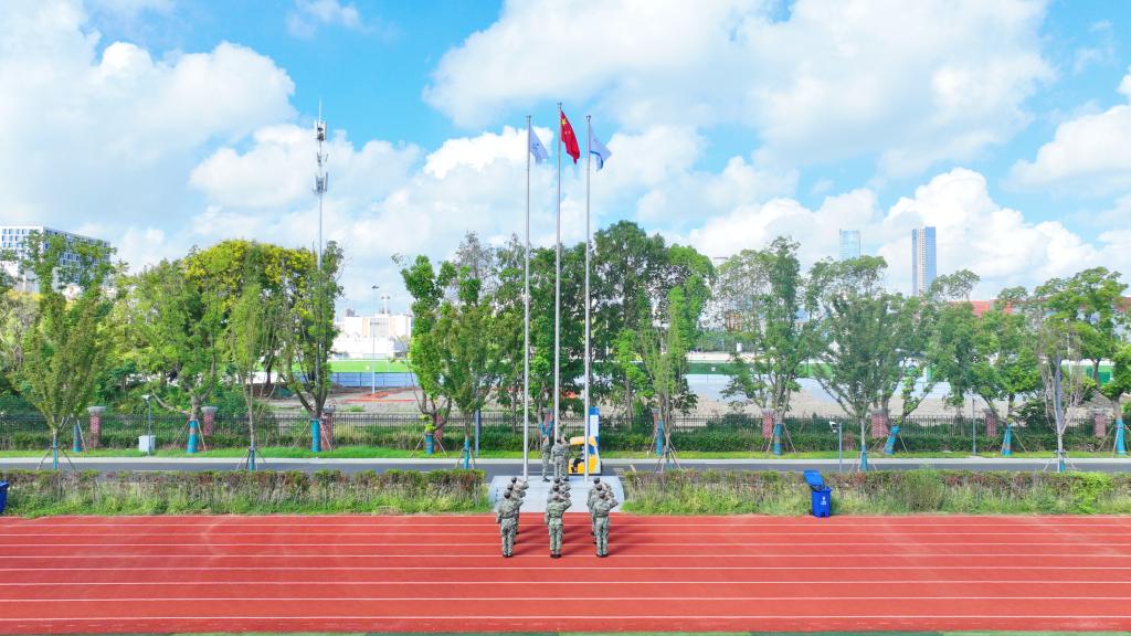 随后,大会举行了庄严的升旗仪式。国旗护卫队队员精神抖擞,迈着铿锵有力的步伐护送国旗至升旗台。在雄壮嘹亮的国歌声中,全体肃立,向鲜艳的五星红旗行注目礼。