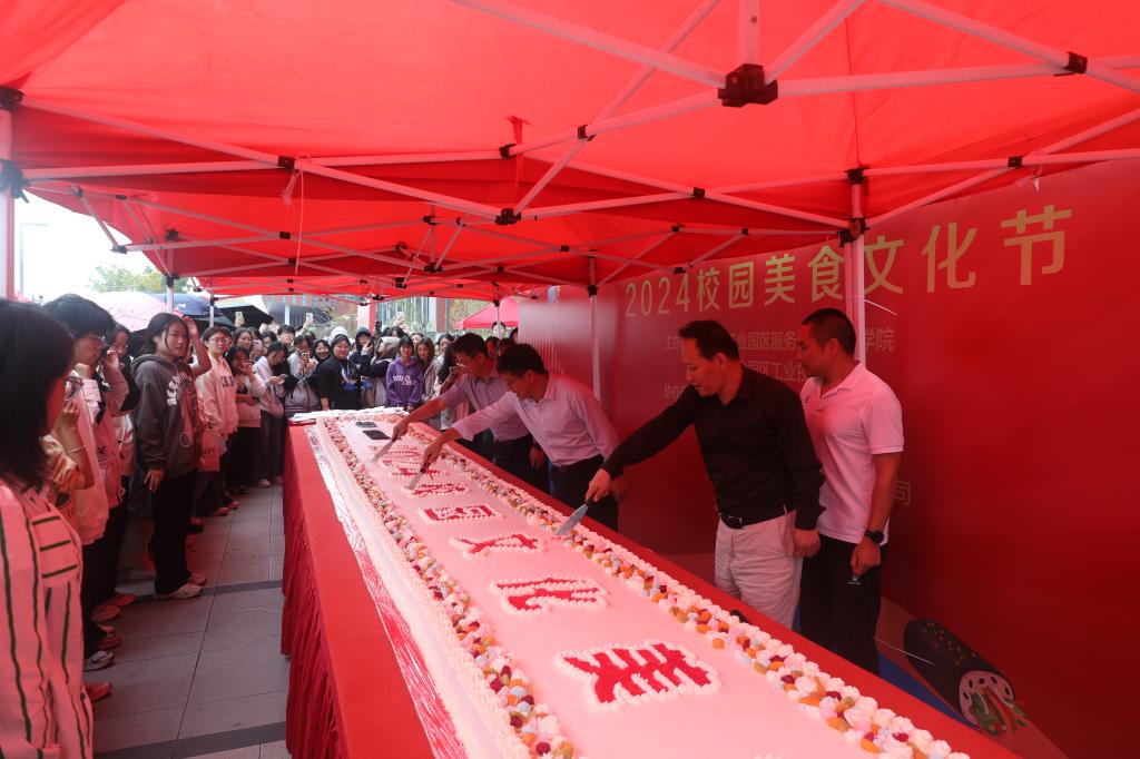 开幕式现场,我校党委副书记、校长权俊良,副校长丁志卫、冯瑞共同切下长度超过10米的美食节主题蛋糕,现场气氛达到高潮。蛋糕香气扑鼻,学生们纷纷品尝,脸上洋溢着幸福的笑容。