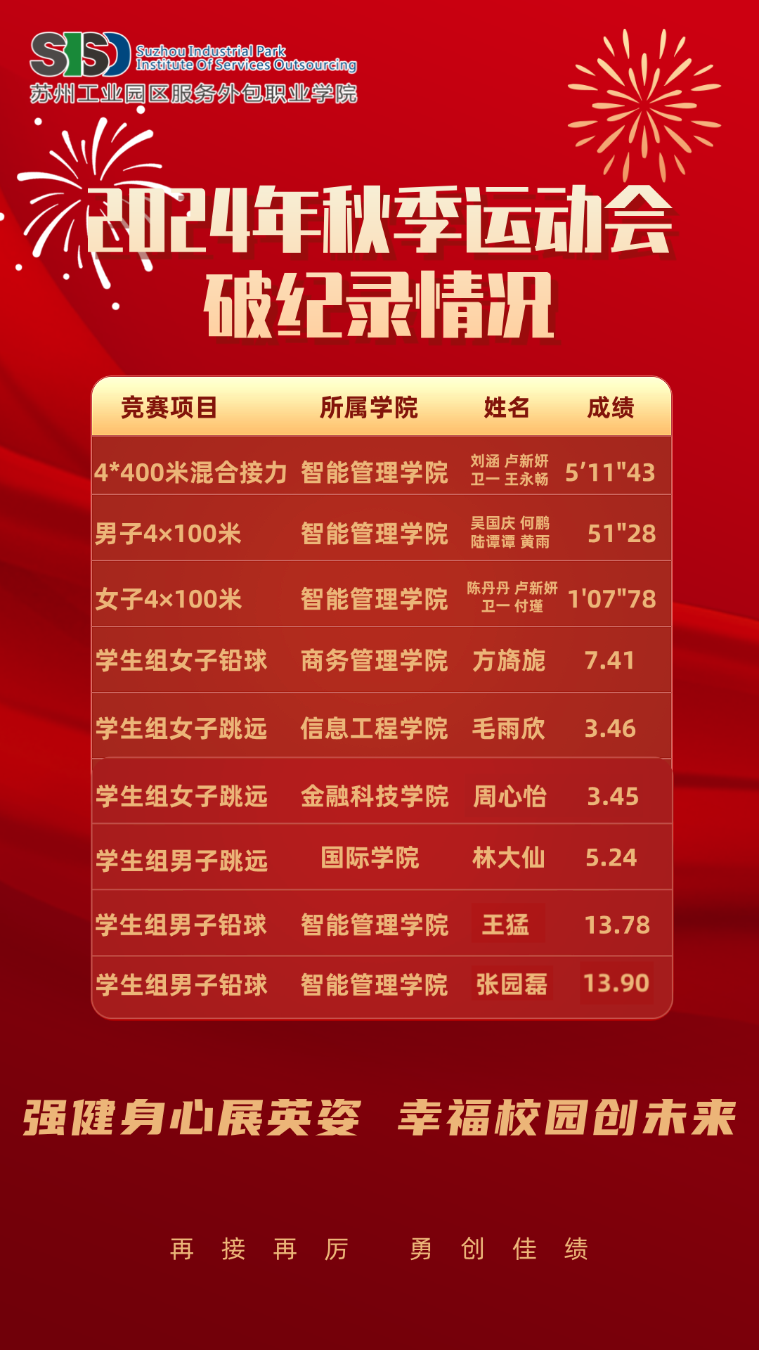 本届运动会共有831名师生参赛,分33个赛项展开激烈角逐,其中,男子女子混合4*400、女子铅球、男子4*100米、女子4*100米、学生组女子跳远、学生组男子跳远、学生组男子铅球7个赛项的校运会记录被刷新。在两天半的赛程中,学校操场成为了一个充满活力和竞技的舞台。运动健儿们充分展示了他们昂扬进取的斗志、勇敢拼搏的信念、团结向上的合力,现场的呐喊声、加油声、喝彩声,声声不断。不论是个人赛项还是团队赛项,运动健儿们全力以赴,展现出了卓越的竞技实力和团队精神。同时,运动会期间我校通过融媒体宣传渠道积极宣传学校运动会开幕式、比赛赛程、运动会拼搏瞬间等,转发量达千余次,累计吸引2万多人次线上关注我校运动会动态。