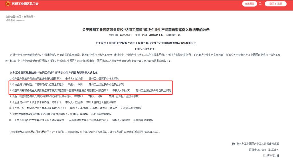 5月21日,在由苏州工业园区总工会主办,苏州工业园区技能人才培育产教联盟承办的苏州工业园区职业院校“访问工程师”解决企业生产问题典型案例征集活动中,我校信息工程学院张娴老师和智能管理学院陶文寅老师提交的《访企拓岗破难题,“精研巧施”促智企新程》《基于具身智能机器人的孤独症数字康复课程在苏州星智未来健康咨询有限公司的应用》两项案例经专家评审成功入选。
