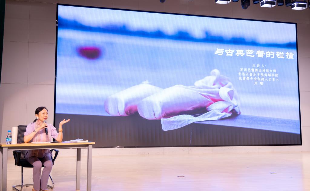 周瑾为师生带来了一场生动的芭蕾艺术讲座。她深入浅出地讲解了芭蕾舞的发展历程,重点介绍了这项艺术在中国的传播与本土化进程。讲座中,周瑾还详细解析了作为芭蕾艺术重要标志的足尖鞋,让师生们直观感受到这项艺术的独特魅力。她指出,芭蕾艺术正是通过不断的传承与创新,才发展成为今天广受欢迎的艺术形式。
