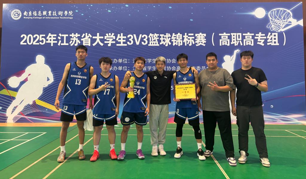 5月25日,2025年江苏省大学生 3V3 篮球锦标赛(高职高专组)在南京信息职业技术学院圆满落幕,我校男子篮球队一路过关斩将,夺得冠军。