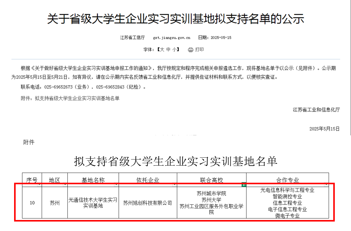 5月22日,江苏省工业和信息化厅公布了《省级大学生企业实习实训基地拟支持名单》,首批共有20家入选,涵盖高端装备制造、数字技术等领域。由苏州旭创科技有限公司牵头,我校与苏州大学、苏州城市学院联合申报的“光通信技术实习实训基地”以扎实的合作内容以及创新合作模式获得评选专家的肯定,成功入选。苏州地区仅4个基地入选,我校荣列其中。这是我校深化校企合作、共育高技能人才的又一标志性成果,为学校职业教育高质量发展再添新动能。