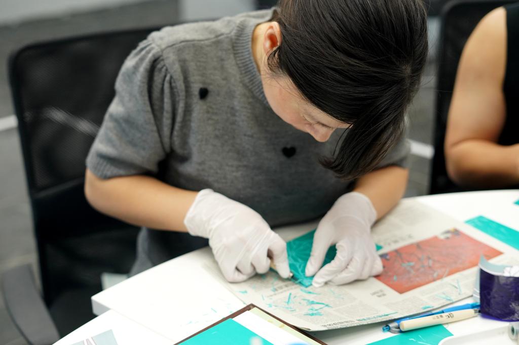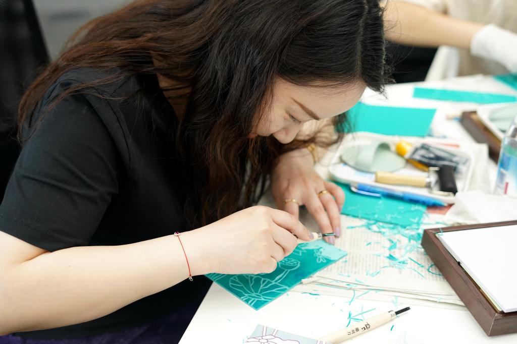 在非遗手工艺讲师的指导下,老师们开启了莲花拓印创作之旅。活动提供的材料包包含雪弗板、油墨、滚筒等专业工具,以及莲花、莲叶等廉洁主题图案素材。讲师首先进行了雪弗板雕刻、拓印技巧等基础技法教学,随后老师们拿起画笔,勾勒出心中的莲花图案,通过“描刻、上墨、拓印、装裱”等环节,将廉洁理念融入艺术创作。