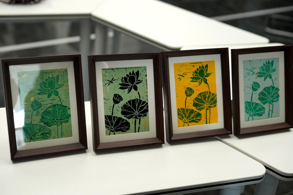 制作流程中,老师们专注地在板上刻画凹印,小心翼翼地涂抹油墨,用滚筒将颜料均匀拓印到宣纸上。一幅幅清新雅致的莲花作品跃然纸上,廉洁二字与莲花图案相互映衬,既是对非遗技艺的传承,更是对廉洁精神的生动诠释。