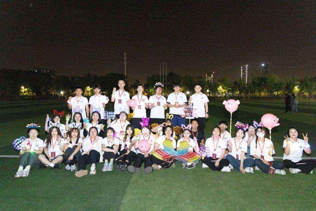 当动感音乐唤醒荧光脉搏,在若水时代俱乐部同学们的带领下,百人齐跳的律动浪潮瞬间点燃夜空。拉伸、跳跃、摇摆,每个细胞都在热浪中苏醒,为接下来的荧光征程注入澎湃能量。夜幕下的校园沸腾着青春的韵律,趣味挑战点燃了整片草坪。参与者们穿梭于关卡之间,同学们在欢声笑语中收获了友谊。这一刻,宿舍楼的界限被打破,青春的热情在夜空中绽放。