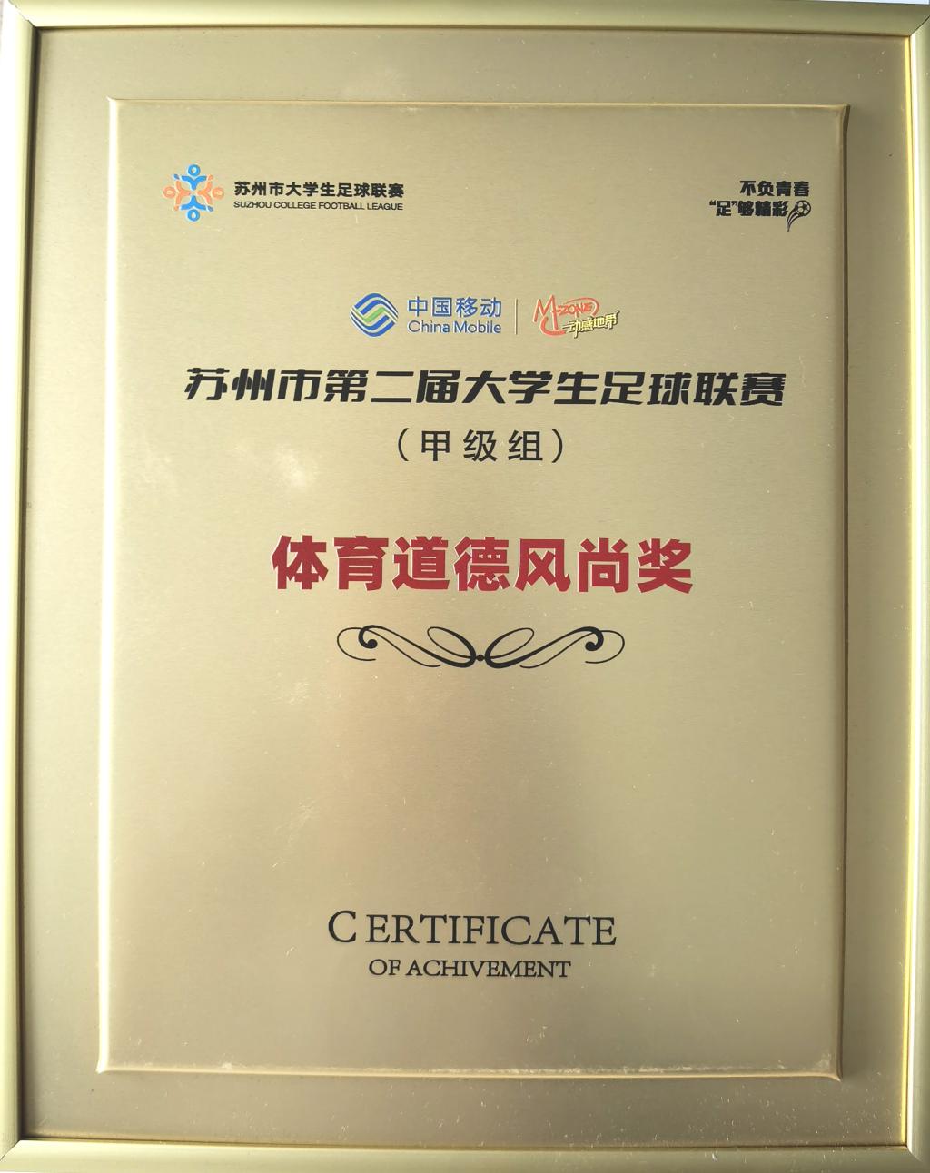 4月18日,中国移动苏州市第二届大学生足球联赛圆满收官。我校首支校级足球队在甲级组赛事中表现亮眼,斩获建队以来首个重要荣誉——“体育道德风尚奖”。该奖项由赛事组委会综合评定,旨在表彰参赛队伍展现出的精神文明与竞赛风范。