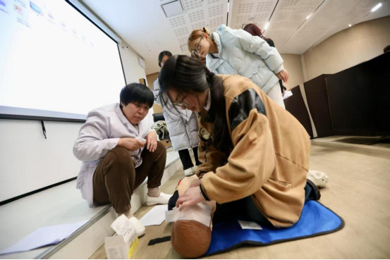 活动中,师生同步学习急救知识要点与操作规范,强化了“黄金四分钟”施救意识。通过反复练习胸外按压深度、人工呼吸节奏及AED配合使用,参训者有效提升应急反应速度;通过三角巾包扎、海姆立克急救法等技能演练,增强了参训师生应对创伤与窒息风险的处置能力。考核数据显示,90%以上参训师生达到初级救护员操作标准。