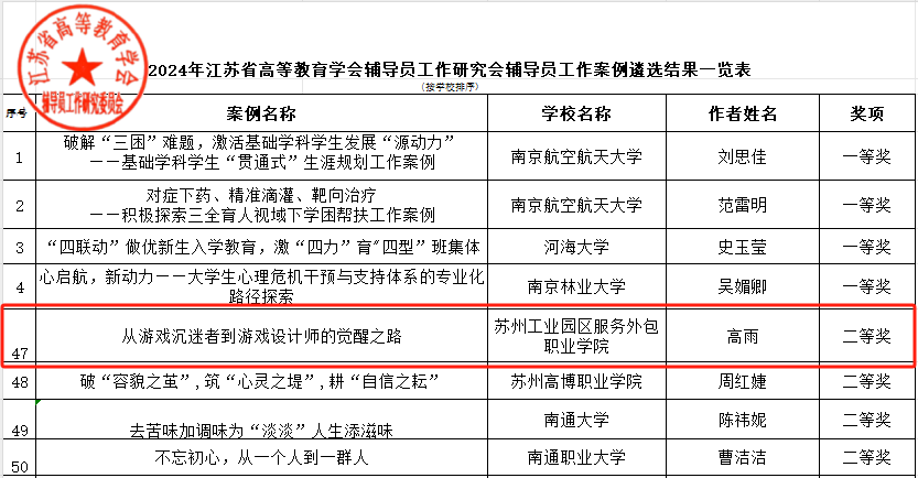 2月下旬,江苏省高等教育学会辅导员工作研究委员会公布了2024年度辅导员工作案例和专项课题遴选结果。我校数字艺术学院高雨老师撰写的案例《从游戏沉迷者到游戏设计师的觉醒之路》获二等奖;金融科技学院苏文燕老师申报的课题《数字化红色文化资源赋能高职思政教育路径研究》入选专项课题指导项目。