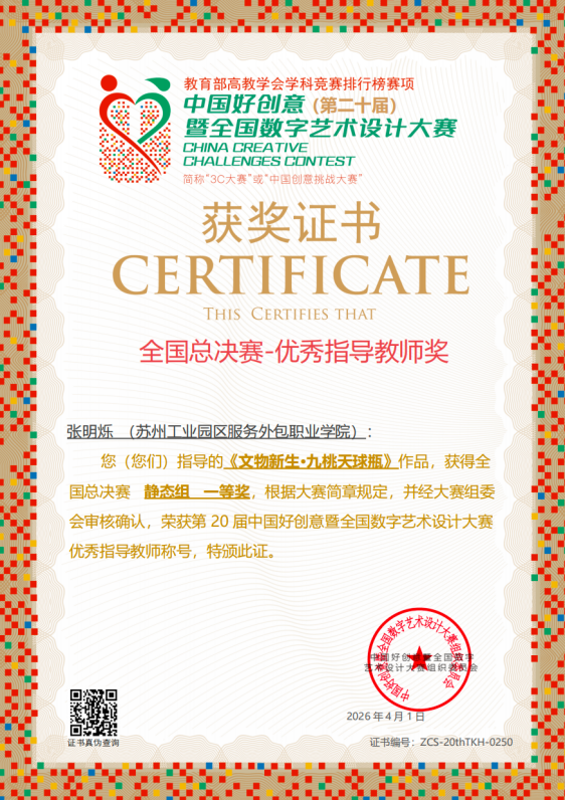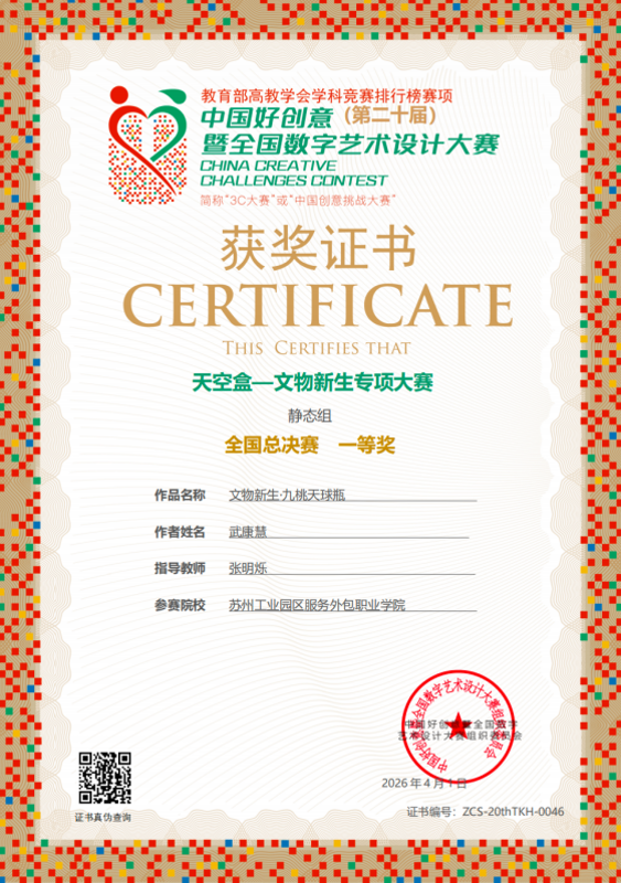 4月1日,第二十届 “中国好创意暨全国数字艺术设计大赛” 专项赛道获奖结果正式公布,我校数字艺术学院动漫制作技术专业 2025 级学生武康慧凭借参赛作品《文物新生·九桃天球瓶》从全国千余所高校、数千件参赛作品中脱颖而出,荣获全国一等奖。指导教师张明烁获“全国总决赛—优秀指导教师奖”。