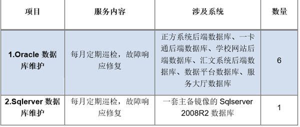 保证数据库的正常运行,常规检查每月不少于一次,需提交检查报告。报告中要反映可能存在的潜在问题及解决方案。系统发生故障时,及时响应,2小时到达现场。故障发生时需要现场服务,信息系统故障在不能得到及时有效处理的情况下,要求在4小时内提出备用解决方案,并立即开展实施。